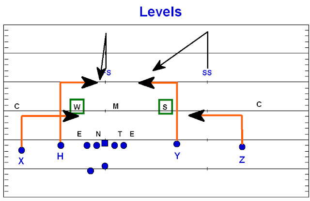 Levels is one of the very best pass plays to attack the Cover 2 pass defense. Smash (Hitch by the #1 outside WR and Corner by #2) is most people's weapon of choice vs. Cover 2, but Levels has a shorter and easier throw than Smash and the Dig route to the field has better leverage on the hash safety than a Corner route does. Safety Leverage is one of the most underrated aspects of the passing game IMO. Also, on Levels your QB is reading the OLB vs. Smash where he is reading the CB, who is generally the defense's quickest and best pass defender. Smash can be dangerous vs. a CB who is good enough to play both the Hitch and the Corner route.